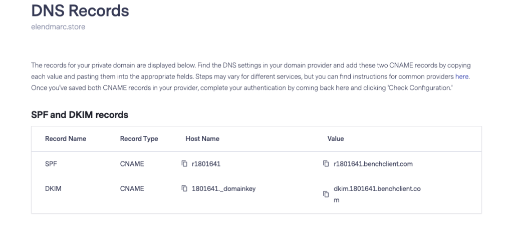 You will now receive the CNAME records for setup. The first one is to configure SPF on a subdomain level, while the other one is to establish DKIM signing.