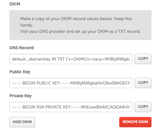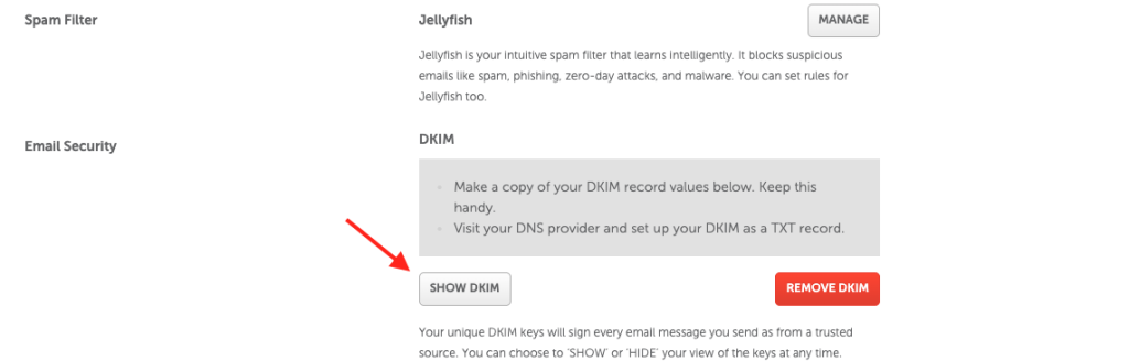 5. Once done, you will see a message appear saying “DKIM has been generated”. To check the host and value for the TXT record, click on Show DKIM: