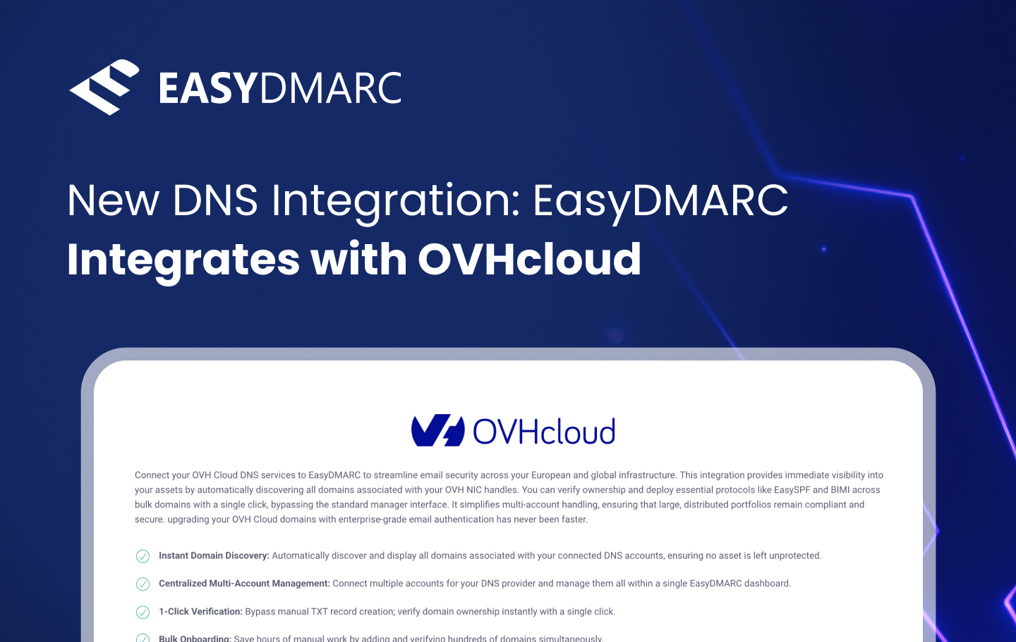 | One-Click Managed Solutions | Activates DMARC, EasySPF, and BIMI without logging into OVH | Centralizes email authentication in one place | Centralizes multi-tenant management without client access |