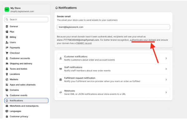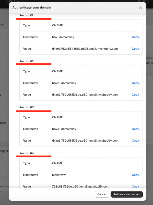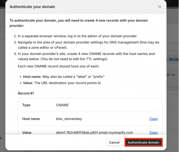 5. After adding the records, return to your Shopify portal and click “Authenticate domain.”