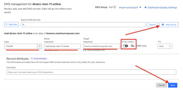 Note: While adding the CNAME record for the bounce domain, make sure that the proxy status is disabled