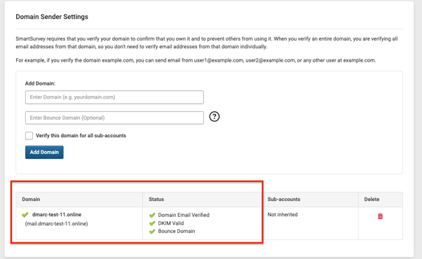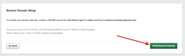 9. Navigate back to SmartSurvey and click the “Verify Bounce Domain” button, after which you should see the message “Success: The bounce domain record has been set up correctly”.