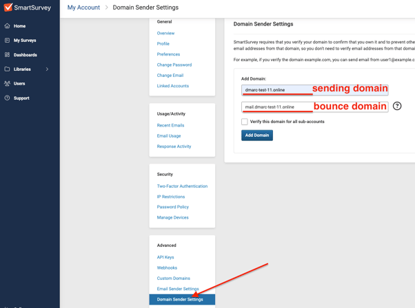 2. Navigate to the “Domain Sender Settings” under the “Advanced” subsection >> Add your domain along with a bounce domain which should be a subdomain of your domain >> Click “Add Domain”