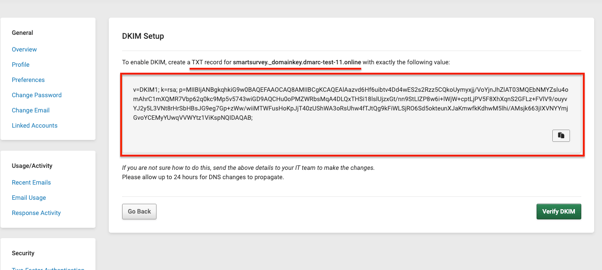 6. Navigate back to SmartSurvey and click on the “Verify DKIM” button after which you should see the message “Success: The DKIM record has been set correctly”.