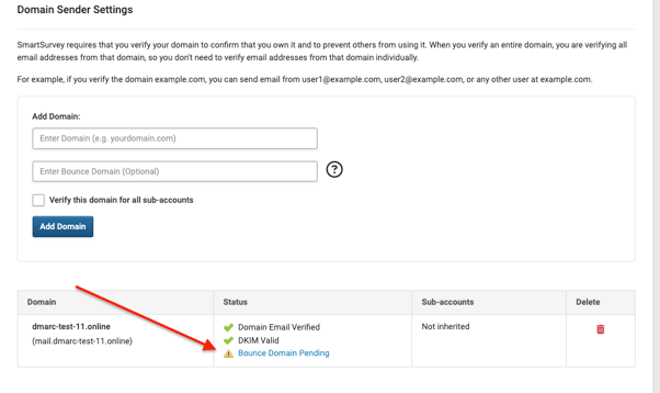 7. Go back to the Domain statuses and click “Bounce Domain Pending”, after which SmartSurvey will provide with instructions for adding a CNAME record for the subdomain that you’ve specified as “bounce domain” in the 2nd step.