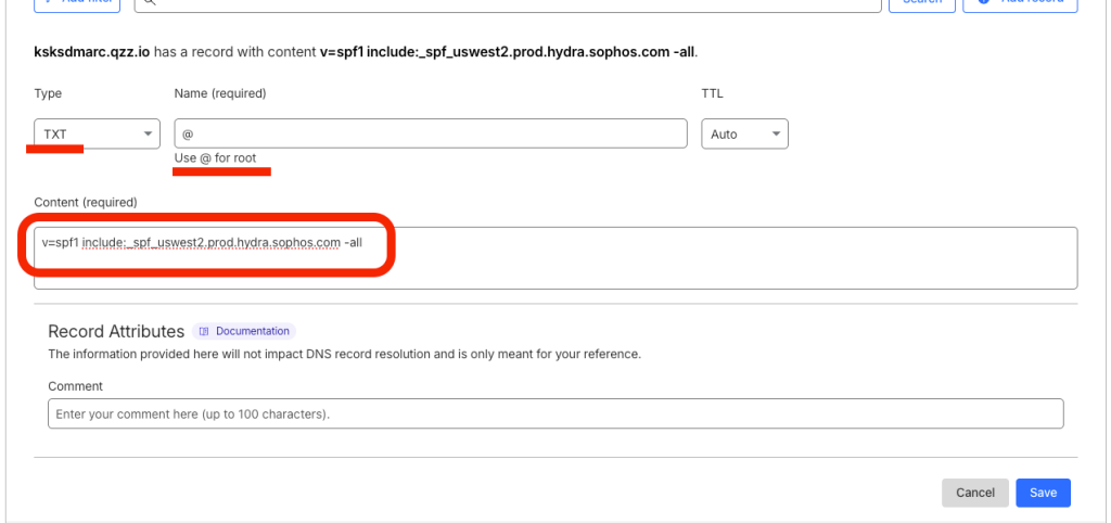 Sophos provides multiple SPF include records. Make sure to select the SPF record that corresponds to the region where your Sophos Email Security instance is hosted.