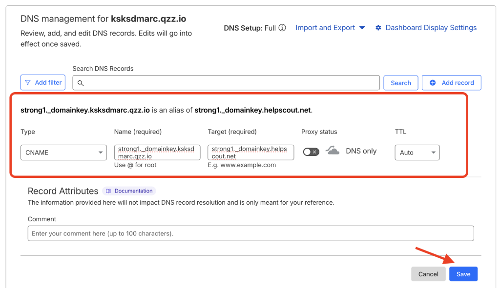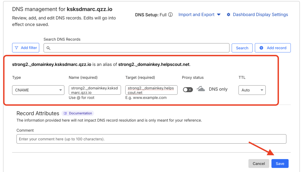 Note: The screenshot below shows an example using Cloudflare as the DNS provider.