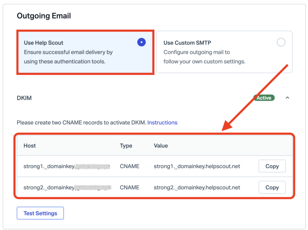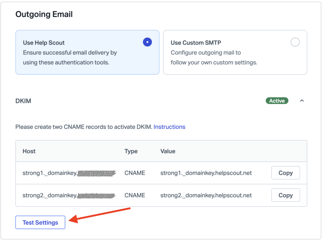 - strong2._domainkey.yourdomain.com will point to strong2._domainkey.helpscout.net
