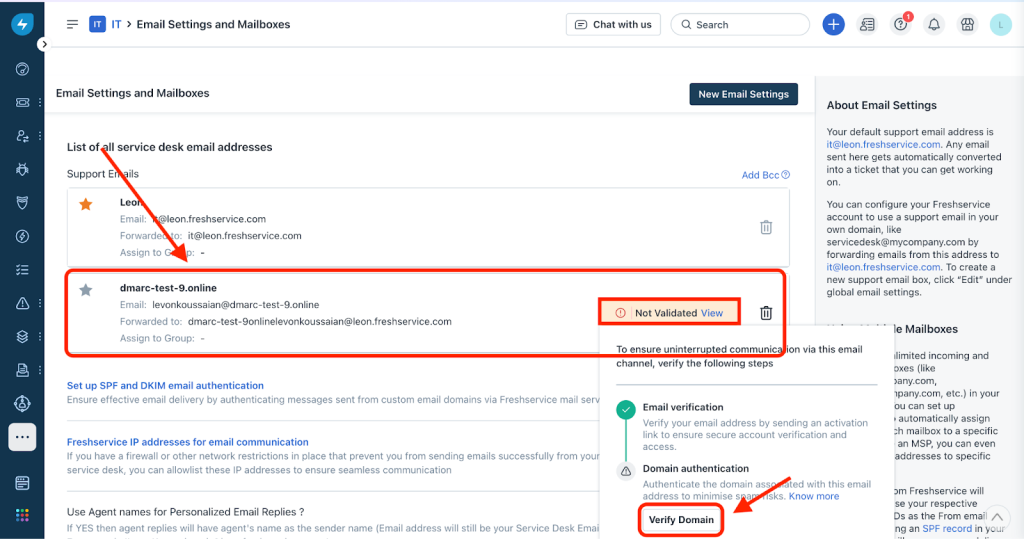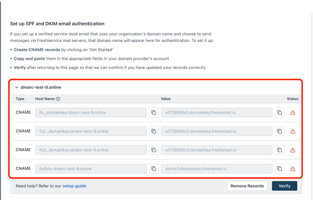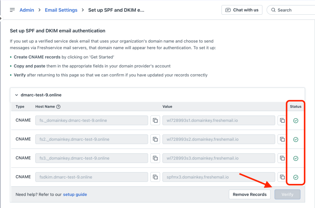 7. Once the DNS changes have propagated, return to your FreshService dashboard and click Verify. If the records are correctly set up, the status will change to Verified, and your domain will be authenticated.