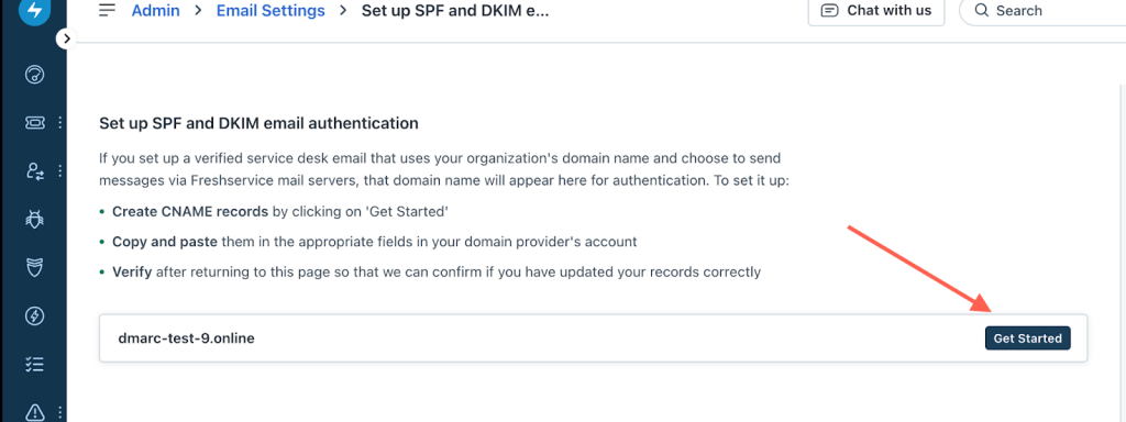 5. Click Get Started to generate the required SPF and DKIM records. FreshService will provide four CNAME records, which must be added to your DNS zone.